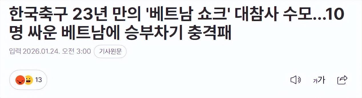 “时隔23年,遭遇越南冲击,巨大耻辱!对手是10个人的越南队。”韩媒无法相信耻辱会在今日到来。“这是一场必须正视的失败。”
